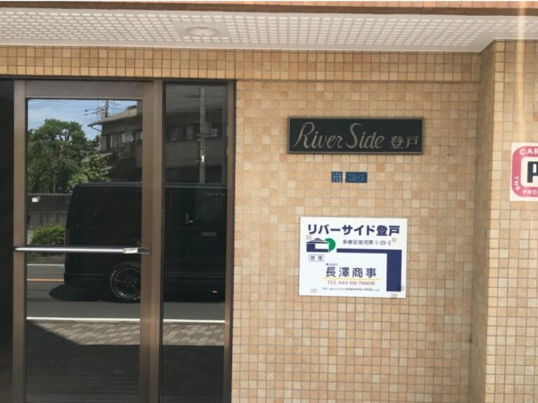 ⑦建物名はリバーサイド登戸になります。向かって右手が車屋さん、左手は花屋さんになっており、中央が入り口になります。