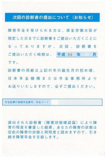 等級に変化がない場合:「次回診断書提出年月のお知らせ」というハガキが郵送されます。